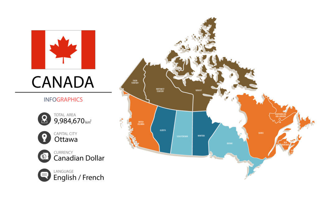 Canada is one very big country – 5,500km from East to West and 4,600km from North to South, the country spans more than half the Northern Hemisphere. It stretches across six time zones.